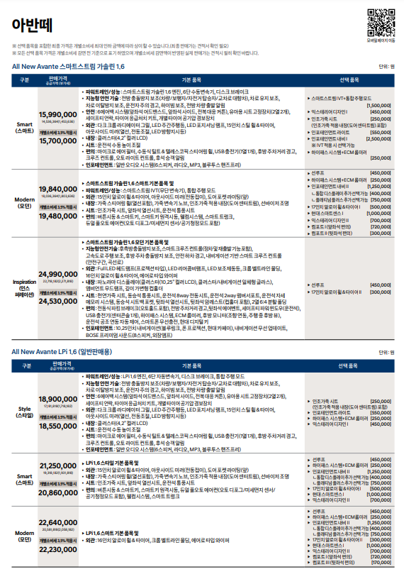 아반떼 스마트스트림 가격표 옵션표 사양표