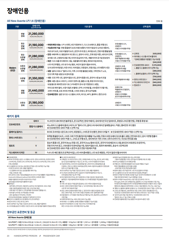 아반떼 렌터카 엘피지 가격표 옵션표 사양표