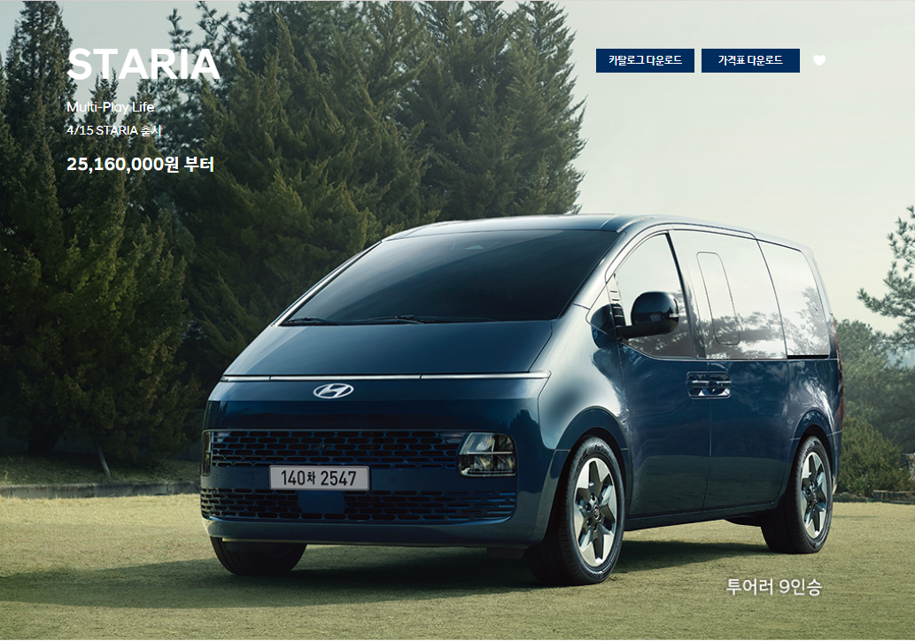 STARIA (스타리아) ㅣ Tourer (투어러) 11인승 110km/h 최고 속도 제한 구분 판매가격 기본 품목 Smart (스마트) 29,320,000 • 파워트레인/성능: 디젤 VGT 2.2 엔진, 8단자동변속기, ISG 시스템, 통합주행모드, 전동식파워스티어링, 후륜멀티링크서스펜션 • 지능형안전기술: 전방 충돌방지 보조(차량/보행자/자전거 탑승자/교차로 대향차), 차로이탈방지보조, 차로유지보조, 후측방 충돌방지 보조, 후방 교차 충돌방지 보조, 스마트크루즈컨트롤(정차및재출발기능포함), 하이빔보조, 지능형속도제한보조, 운전자주의경고, 전방 차량 출발 알림, 후석 승객 알림 • 안전: 7에어백시스템(앞좌석 에어백/앞좌석사이드/운전석무릎/전복 감지 사이드 커튼), 전좌석 3점식 시트벨트, 전좌석 헤드레스트, 다중충돌방지자동제어시스템, 개별타이어공기압 경보 장치, 타이어응급처치키트, 유아용시트고정장치(2열2개) • 외관: 17인치스틸휠& 타이어, 리어스포일러, LED 보조제동등, 리어글래스열선, 바디 컬러아웃사이드도어핸들, 아웃사이드미러(전동접이, 전동조절), 후석 파노라믹 윈도우, 전/후륜17인치브레이크디스크 • 내장: 클러스터(4.2” 컬러 LCD, 디지털), D&N 룸미러, 수동식틸트& 텔레스코픽스티어링휠, 리놀륨 플로어 카페트 • 시트: 직물시트, 앞좌석 열선시트, 운전석수동높이조절, 운전석암레스트(조절식), 동승석 슬라이딩 & 리클라이닝 시트, 2~4열롱슬라이딩시트, 2~4열풀플랫시트, 2열6:4 분할시트(리클라이닝/폴딩), 3열독립 시트(리클라이닝/폴딩/암레스트), 4열쿠션팁업시트(폴딩) • 편의: 전동식 파킹 브레이크(오토홀드 포함), USB 충전기 5개(1열1개/2열2개/3열2개), 후방 주차거리 경고, 오토라이트컨트롤, 매뉴얼에어컨, 후석 루프 에어 벤트, 마이크로 에어 필터, 파워 아웃렛(1열1개) • 인포테인먼트: 일반오디오시스템(4스피커, 라디오, MP3, USB, 블루투스 핸즈프리) Modern (모던) 30,840,000 ▶ 11인승 스마트 기본 품목 및 • 안전: 세이프티파워윈도우(운전석) • 외관: 17인치알로이휠& 타이어, 바디 컬러아웃사이드미러(열선, LED 방향지시등), 유광 필라 가니쉬 • 내장: 선바이저거울& 조명& 슬라이딩, 가죽스티어링휠(열선포함), 가죽변속기노브, 루프트레이(운전석/동승석 상단 수납함) • 시트: 인조가죽시트(블랙/베이지) • 편의: 버튼시동 & 스마트키, 스마트키 원격시동, USB 충전기(4열2개) Tourer 11 (11인승) 2021년 4월 15일 기준 (단위: 원) 구분 판매가격 기본 품목 Modern (모던) 30,840,000 ▶ 11인승 모던기본 품목및 • 시트: 2~3열 슬라이딩 시트, 2~3열 풀 플랫 시트, 3열 쿠션 팁업 시트(폴딩) ※ 미적용 : 4열 쿠션 팁업 시트, 3열 독립 시트, 롱 슬라이딩 시트, USB 충전기(4열2개) Tourer 9 (9인승) STARIA (스타리아) ㅣ Cargo (카고) 패키지 품목 멀티미디어 라이트 8인치 디스플레이 오디오, 후방모니터(조향 연동, 주행 중 후방 뷰), 하이패스 시스템 ※ 멀티미디어 내비플러스 I 과 중복 선택 불가 멀티미디어 내비플러스 I 10.25인치 내비게이션(블루링크, 폰 프로젝션, 현대 카페이), 후방모니터(조향 연동, 주행 중 후방 뷰), 트위터 스피커, 버튼시동 & 스마트키, 스마트키 원격시동, 풀오토 에어컨(미세먼지 센서/공기청정모드/애프터 블로우), 고속도로 주행 보조, 내비게이션 기반 스마트 크루즈 컨트롤(안전구간, 곡선로), 하이패스 시스템 ※ 6단 수동 변속기와 중복 선택 불가 II 10.25인치 내비게이션(블루링크, 폰 프로젝션, 현대 카페이), 후방모니터(조향 연동, 주행 중 후방 뷰), 트위터 스피커, 풀오토 에어컨(미세먼지 센서/공기청정모드/애프터 블로우), 고속도로 주행 보조, 내비게이션 기반 스마트 크루즈 컨트롤(안전구간, 곡선로), 하이패스 시스템 ※ LPG 엔진 선택 시 애프터 블로우 기능 미적용 익스테리어 디자인(3인승) LED 헤드램프(MFR 타입), LED 주간주행등, LED 포지셔닝 램프 익스테리어 디자인(5인승) LED 헤드램프(MFR 타입), LED 주간주행등, LED 포지셔닝 램프, 2열 플러쉬 글래스 컴포트(3인승) 스마트 파워 테일게이트, 앞좌석 통풍시트, ECM 룸미러 ※ 트윈 스윙 도어와 중복 선택 불가 컴포트(5인승) 스마트 파워 테일게이트, 앞좌석 통풍시트, 운전석 8way 전동시트, 운전석 4way 럼버서포트, ECM 룸미러 ※ 트윈 스윙 도어와 중복 선택 불가 테크 전방 주차거리 경고, 서라운드 뷰 모니터, 스마트폰 무선충전 ※ 트윈 스윙 도어와 중복 선택 불가 ※ 멀티미디어 내비플러스 II 선택 시 선택 가능 선택 품목 스마트 공통 선택 품목 ▶ 6단수동변속기 (ISG 시스템, 스마트 크루즈 컨트롤, 전동식 파킹브레이크, 통합 주행 모드 제외) ▶ 트윈스윙도어 ▶ 멀티미디어라이트 ※ 멀티미디어내비플러스 I 과중복선택불가 ▶ 멀티미디어내비플러스 I ※ 6단수동변속기와 중복 선택 불가 [-2,100,000] [400,000] [750,000] [2,250,000] 모던 공통 선택 품목 ▶ 스마트스트림 LPG 3.5 엔진(ISG 시스템 제외) ▶ 트윈 스윙 도어 ▶ 윈도우 밴(3인승) ▶ 윈도우 밴(5인승) ▶ 멀티미디어내비플러스 II ▶ 익스테리어 디자인(3인승) ▶ 익스테리어 디자인(5인승) ▶ 컴포트(3인승) ※ 트윈 스윙 도어와 중복 선택 불가 ▶ 컴포트(5인승) ※ 트윈 스윙 도어와 중복 선택 불가 ▶ 테크 ※ 트윈 스윙